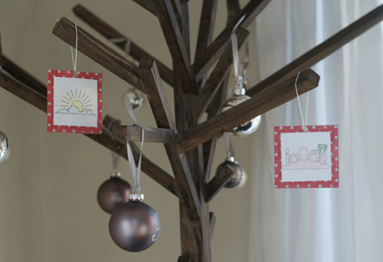 Last year we did our first Jesse Tree with Emma. If you’ve never heard of a Jesse Tree, it’s an advent activity. Each day you color an ornament that represents a bit of the lineage of Christ. The tree begins with creation and stretches through the Old and New Testaments until you reach the story of the birth of Jesus. Each day you read the scripture and add a corresponding ornament to a small tree. The tree can be a small artificial Christmas tree, some branches in a bucket… whatever works for you.