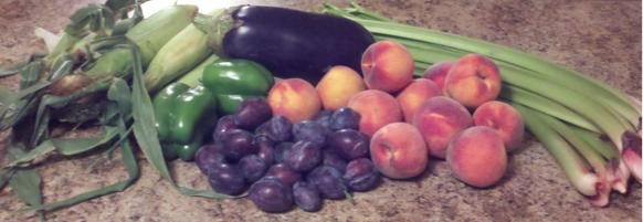 This week was the first time that we had made it to the local farmers’ market, and I’m SO glad we went! Emma had a ball, and it’s good for her to meet some of the people who grow the food we eat. Our farmers’ market isn’t huge, but there was a nice selection of produce there this week. I even went out on a limb and bought a couple of things that I have no CLUE what to do with, an eggplant and some rhubarb. So if anyone has recipes for those, I’d LOVE to have them!