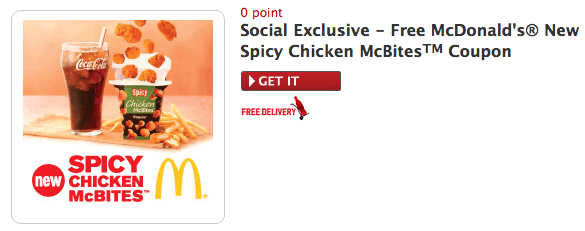 Right now members of MyCokeRewards can get free Spicy Chicken McBites from McDonald’s. Just log in to your MyCokeRewards account (or sign up for an account if you don’t have one), and you’ll see the free offer. This is a physical coupon that’s shipped to your home. Click here to get yours.