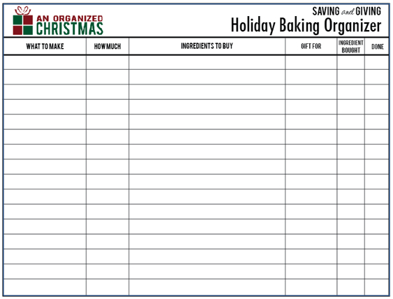 I’m planning to make our list and do our ingredient inventory this weekend. Then I’ll be carrying my Baking Organizer in my purse so that I can watch for sales on the ingredients that we still need to buy. I’m also planning to pick up an extra bag of flour or sugar or something each time I go to the grocery store in November. Hopefully this will help us all stay more organized and save money on our baking.
