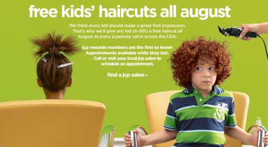JCPenney is offering a free haircut for K-6 students during the month of August. I would recommend calling your salon now to make sure they’re participating and to set up an appointment. I’m guessing they’ll book these pretty quickly.