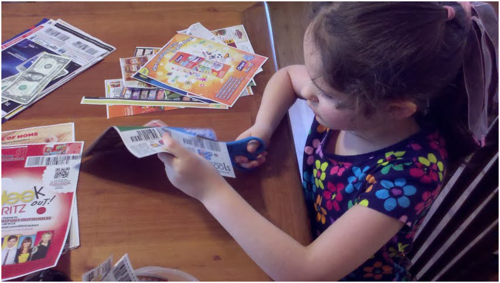 We need to come up with ways for Emma to earn money around the house. Some tasks will not be money-makers (feeding the dog, helping unload the dishwasher). We want her to value those tasks as her contribution to our family. But we also want her to have some optional tasks that she can do to earn money. Yesterday she unloaded the groceries from the bags and put away what she could reach. Today she was paid to clip Mommy’s coupons. (Yes, we’re sneaking in some fine motor skills practice there!)