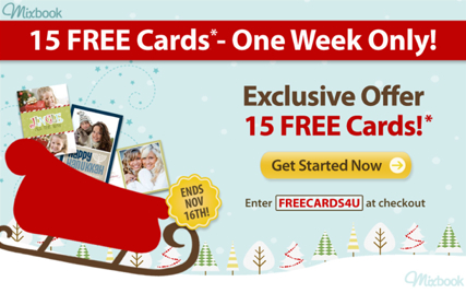 Mixbook is offering 15 FREE customized holiday cards right now. Use the promo code FREECARDS4U at checkout to get them free. You just pay shipping. Mine was $4.39 for the Budget shipping (cards arrive by 11/29). You have to choose the 5×7 size and the Classic Coated option for the code to work.