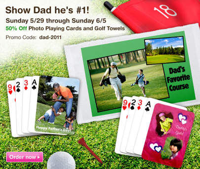 If you have a dad who likes to play cards or golf, here are a couple of fun photo deals that might help you personalize a gift for him. SeeHere has their photo playing cards and photo golf towels on sale 50% off now through Sunday (6/5). Just enter the promo code dad-2011 at checkout. Head over to SeeHere to design your gifts.